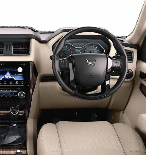 Inside, the Scorpio offers practical features designed for comfort and convenience. Depending on the variant, you’ll find options like manual air conditioning, digital MID, power steering, touchscreen infotainment, and more. The spacious 9-seater configuration (2+3+4 layout) makes it an ideal family SUV or transport solution for businesses in semi-urban and rural markets.