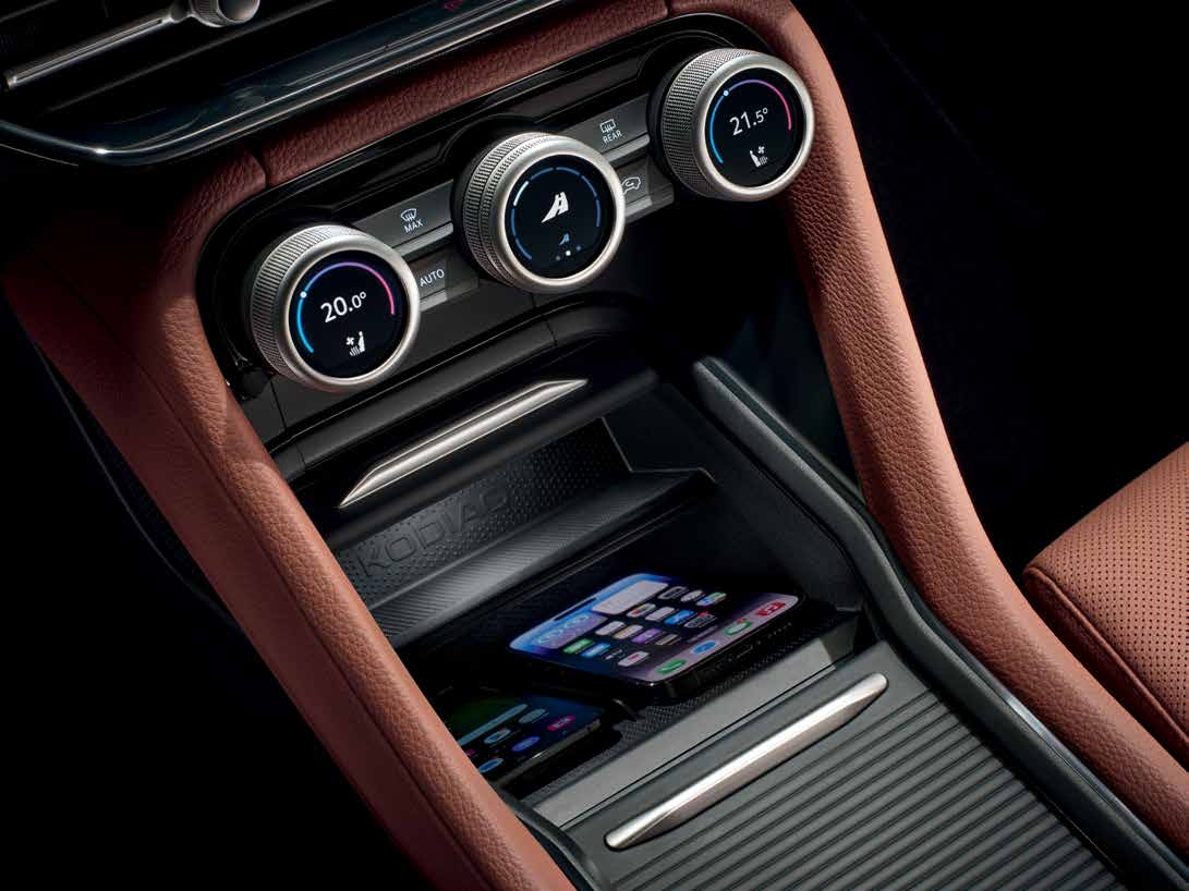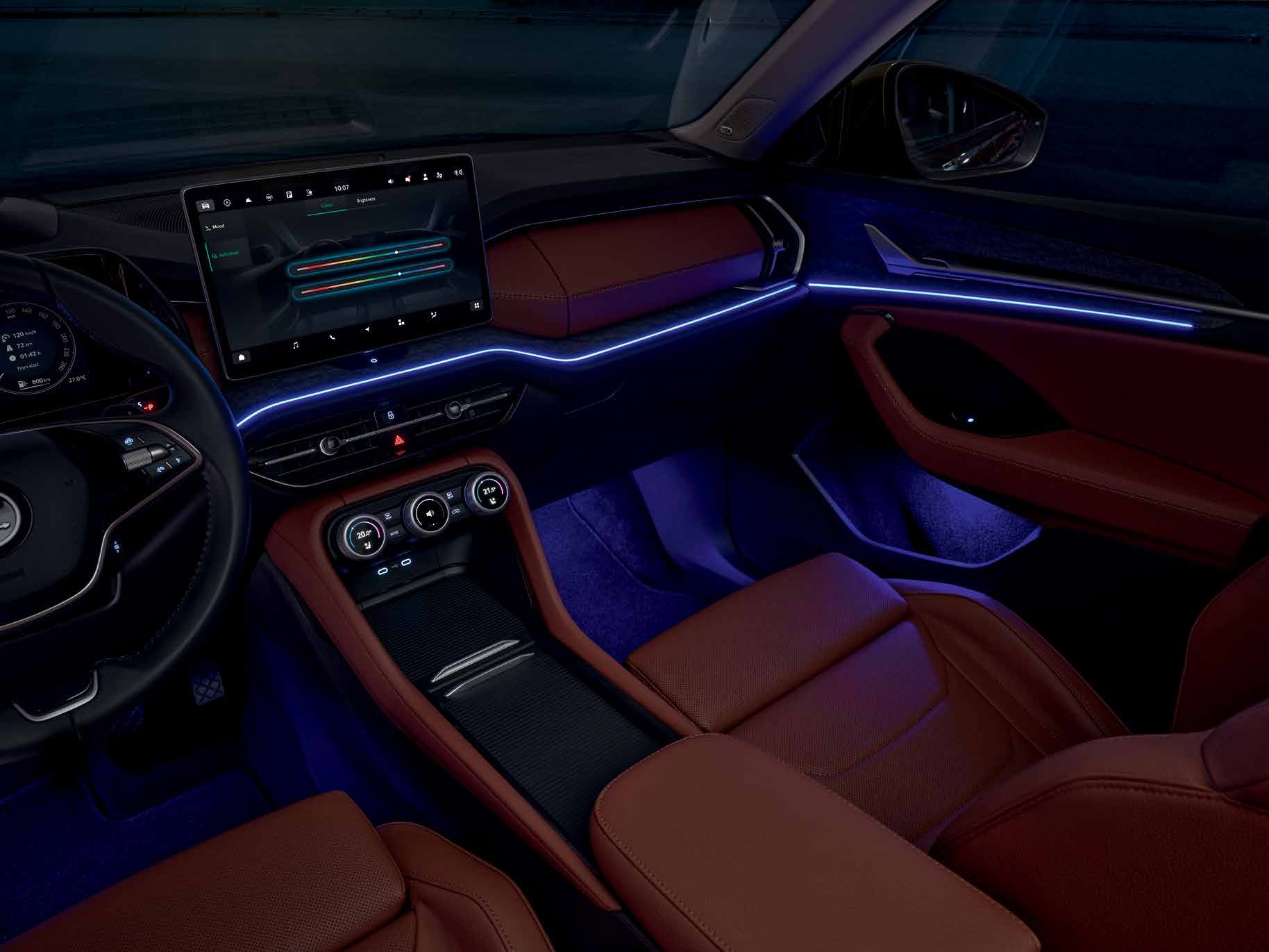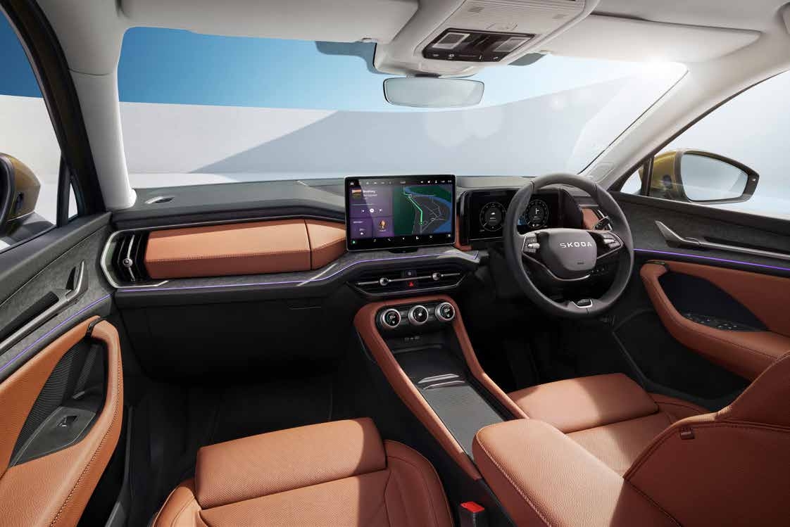 Inside, the Kodiaq pampers occupants with ventilated front seats, 3-zone climate control, a panoramic sunroof, and a high-end 12-speaker Canton audio system. The smart layout includes adjustable second-row seats and a usable third row, making it a practical choice for those needing flexible space without compromising comfort or style.